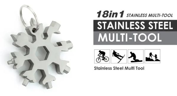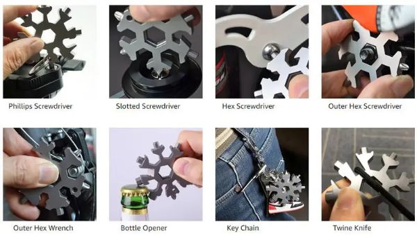 A MULTIFLAKE szerszám használható a sörösüveg kinyitásához, a csavar elfordításához, a snowboard, a kerékpár, a játékok és így tovább javításához.