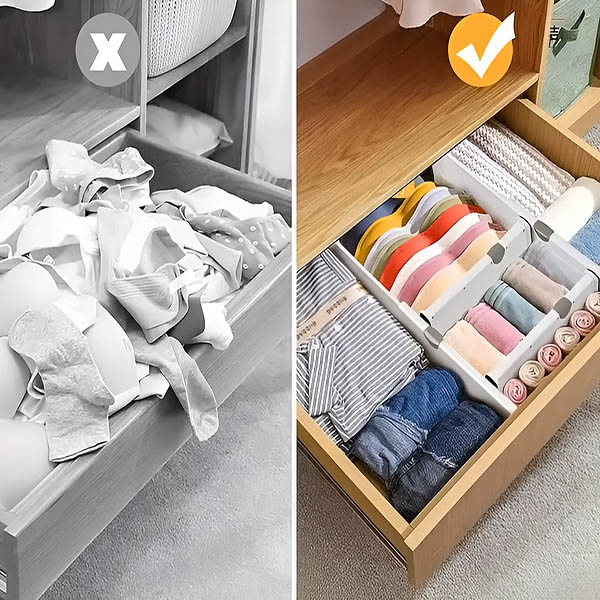 Legyen szó konyhai eszközökről, fürdőszobai piperecikkekről vagy zoknikról a hálószobában – ezek az elválasztók 28 cm-től 45 cm-ig állíthatók, hogy a legtöbb fiókhoz illeszkedjenek. Pontosan az igényei szerint alakíthatja ki a teret.