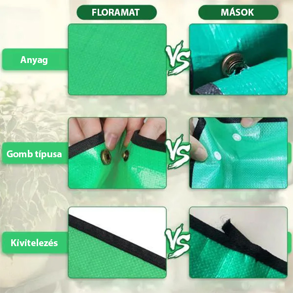 A megvastagított PE vízálló szövetből készült FLORAMAT-ot úgy tervezték, hogy sérülés nélkül bírja a gyakori hajtogatást és a nagy igénybevételt. Kétoldalas vízálló tulajdonságai és gyorsan száradó képességei biztosítják, hogy megbízható társ maradjon minden kertészeti projektjében.
