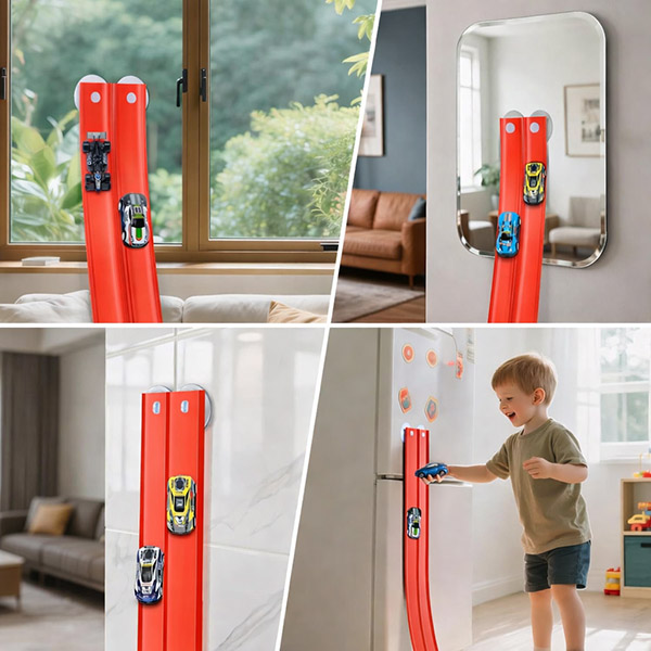 A tapadókorongos rögzítés lehetővé teszi a gyerekek és a szülők számára, hogy gyorsan állítsák a szögeket és az elrendezést, így a pálya újra és újra átalakítható szerszámok vagy bonyolult beállítás nélkül.