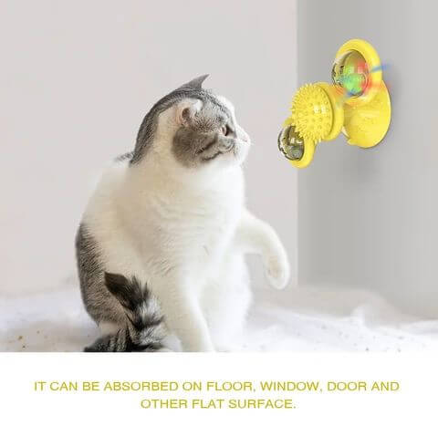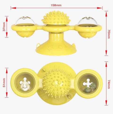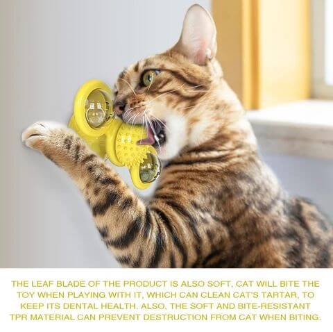 - A szélmalom kerek pengén két átlátszó tartály található, amelybe könnyű golyókat, harangokat és mentagolyókat helyezhetnek el a macskák vonzására. Amikor a szélmalmot óvatosan mozgatják, akkor az elforog, így a macskák szeretik, hogy ne engedjék el a karmaik közül, középen pedig egy haj- és arcdörzsölő eszköz van