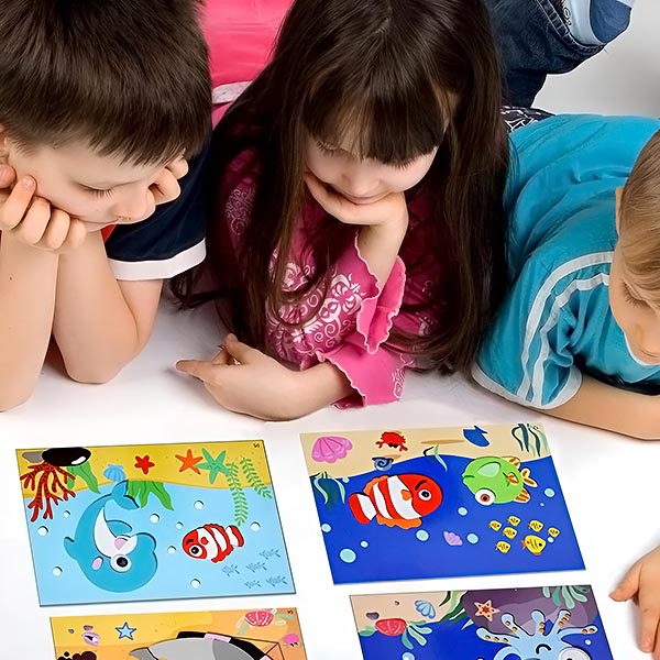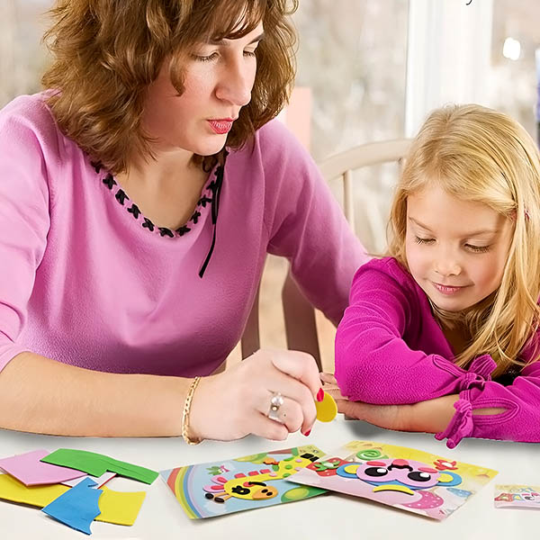 Nincs szükség ragasztóra vagy ollóra, így nem kell aggódnia, hogy gyermeke megsérül. Csak húzza le a ragasztót, és ragassza fel a kartonra rétegenként a felszólító képnek megfelelően.